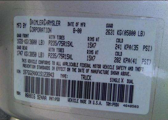 VIN: 1B7GG2AXX1S123943