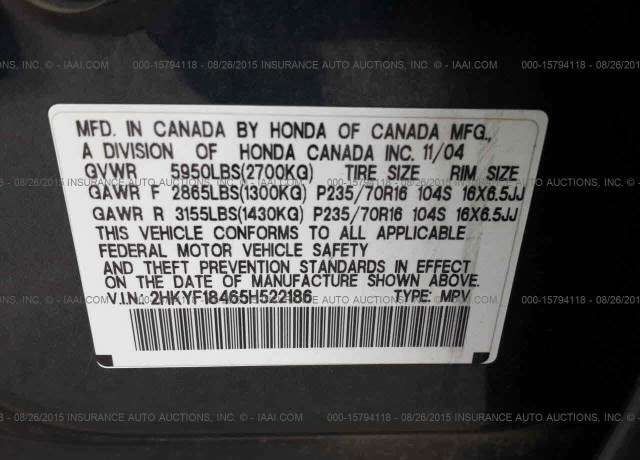 VIN: 2HKYF18465H522186